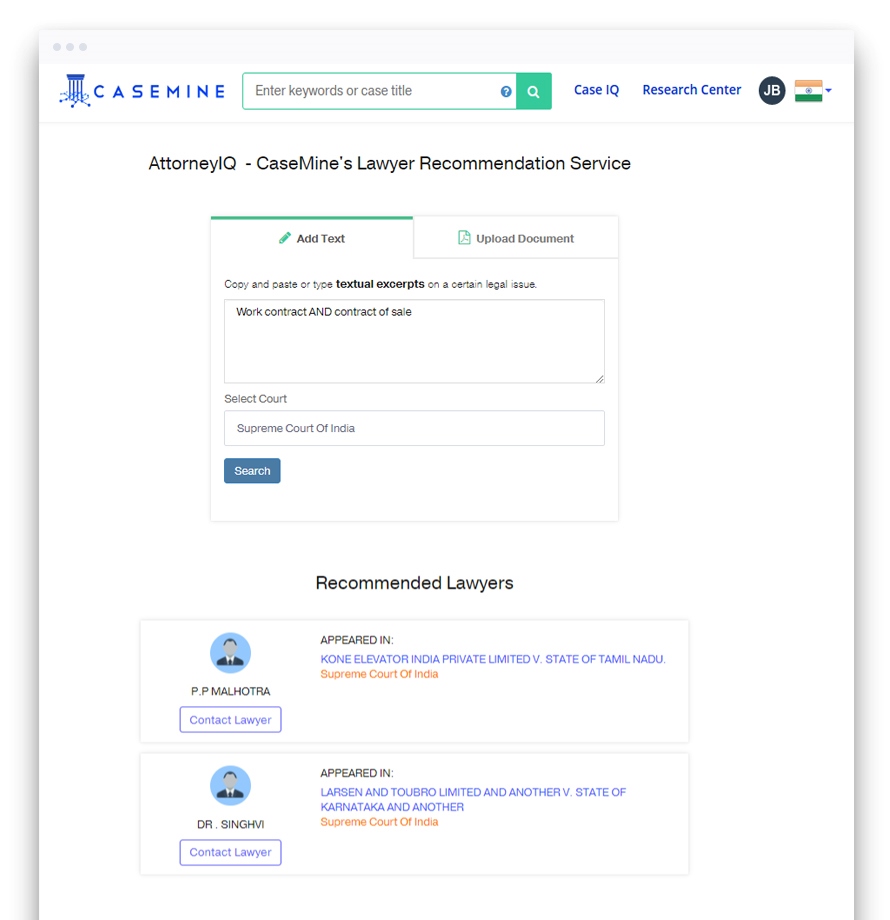 AttorneyIQ gives you two ways of kick starting your lawyer search. You may either describe the legal issues and essential facts revolving around your dispute by way of queries, or by uploading documents related to the dispute like a lower court order, a pleading, briefs or even case notes etc.. Once this is done, you will be further required to select the court where the litigation will be initiated, or is already ongoing. On the basis of this information, our algorithms will suggest lawyers that have appeared in cases dealing with similar factual and legal issues as those in the queries or documents.